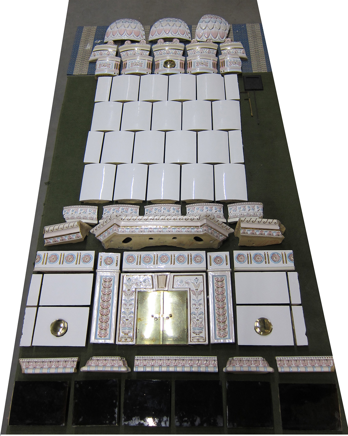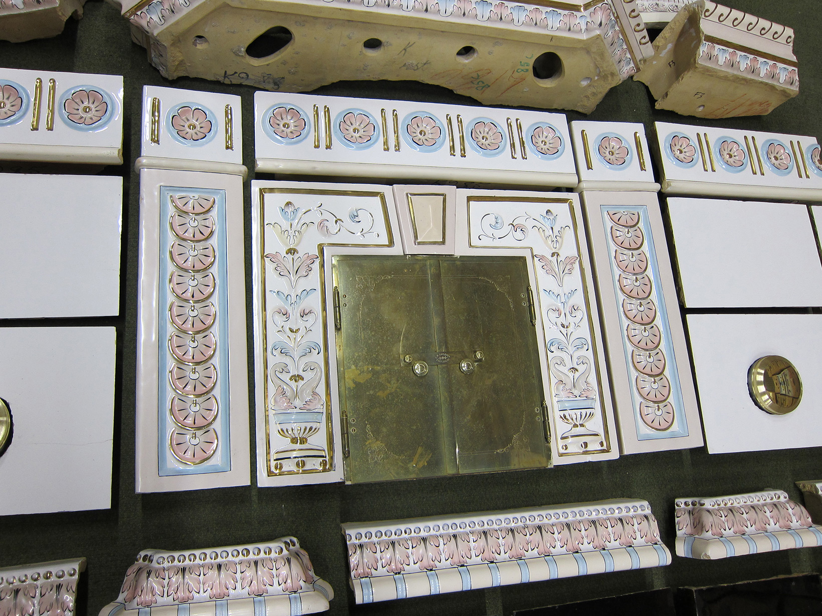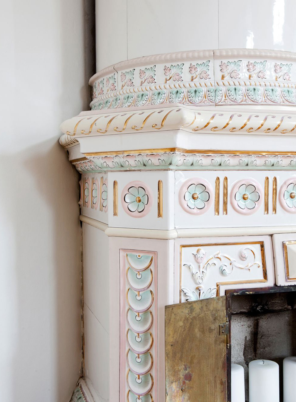 White columnar stove in pastel colours, ca 1890. Height 300.